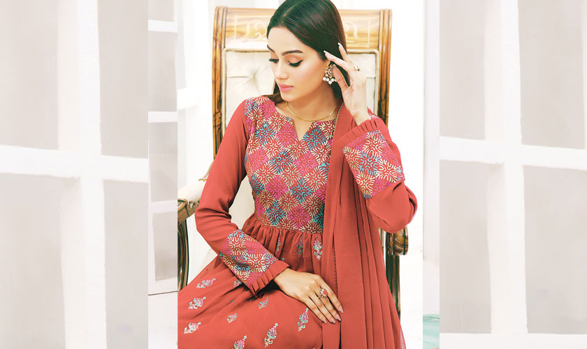 This maroon chiffon pishwas flows nicely and has a classic feel. Great for evening events or weddings. Style it with gold bangles, a deep red lip, and khussas for a full on desi look.