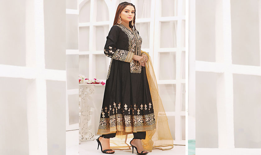A simple black silk peshwas that works well for formal dinners or barat nights. Add a bold eye look, statement earrings, and heels to dress it up. It’s timeless and easy to repeat with different accessories.