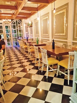 According to Sahar, there is nothing more beautiful and nostalgic than a classical checkered floor. “While choosing the flooring; my first love has always been the classic black and white look. So, I chose a high gloss black tile to alternate with a white/grey floor tile with additional perky light bulbs along the ceiling to add colour and dimly light up each table. I have always been inspired by the colonial look as my own ancestral homes in Sargodha have the same chequered floors and classical accents that I’ve grown up around.”