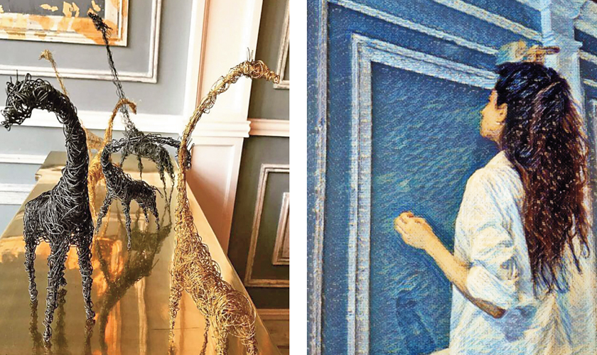 The owners definitely know their way around food since the menu is very eclectic and coincides perfectly with the surreal theme of the interior. The powder room catches most of the attention with a smaller checkered floor merges into a thin bricked mirror wall. The light bounces off the mirror tiles and gives it that dreamy surreal effect. The central piece is a chandelier as a classic take on the Belgian surrealist painter, Rene Magritte whose paintings display amusing juxtapositions of the ordinary. The gold copper wire giraffes are exclusively created by Sahar’s talented cousin, sculptor Bilal Noon. Over the main counter wall she has painted the figure from the actual Burning Giraffe painting but has given it her own take with actual drawers coming out in 3D form out of the wall.