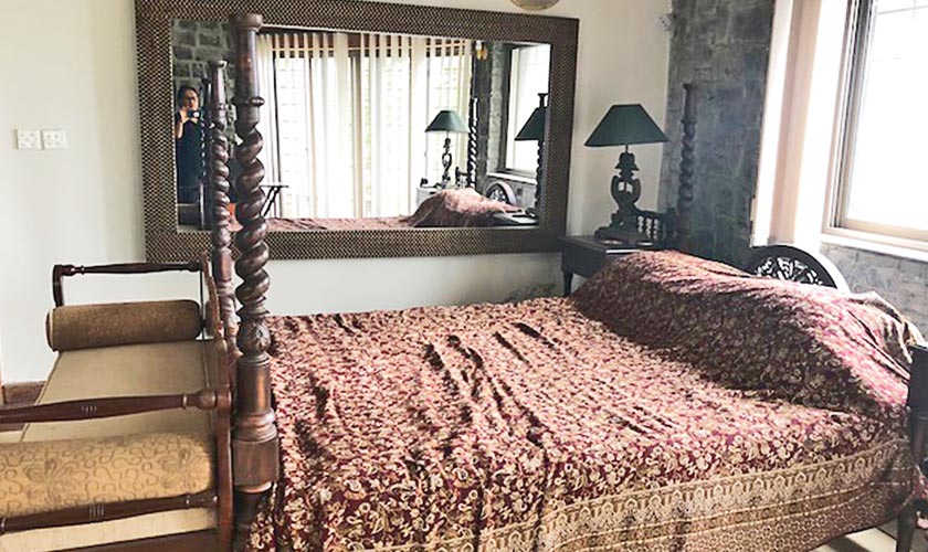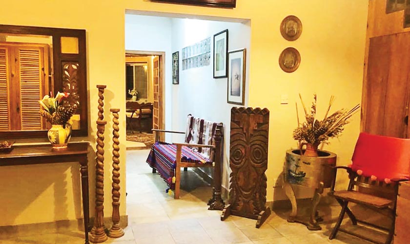 The bedrooms have stone walls and classic wood furniture with lovely paintings on the wall. The windows have very light blinds so that they don’t take away from the surrounding beauty, both inside and outside the bedroom. The sitting room windows are bare, with only colourful window dressings that Mr Salim got from Haripur. “The windows to me are not bare, as they show the beauty of nature. Why would one want to see a span of fabric when you have fabulous hundreds of years old trees as a visual,” interjects Ainee.