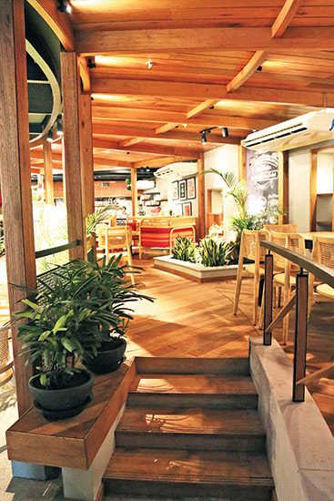 The interior is rustic with emphasis on greys and earthen hues. Wooden structures have been erected with lights strategically placed within the structure. The varied shades of brown create a perfect backdrop for the eye-catching greens of the liberally scattered plants throughout the cafe.