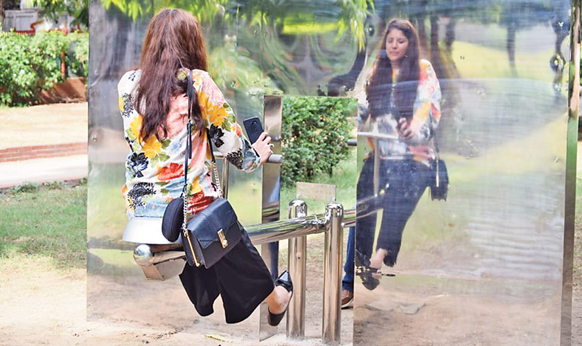 A prominent installation that gave a very important message and brought smiles onto the faces of the viewers was a collaborative piece, by Qinza Najm and Saks Afridi, called ‘Don’t grow up, it’s a trap’.This installation made a very obvious statement on how people, when younger, are flexible to changes and accept one another for who they are; hence they could see each other on the seesaw. However, when they start to grow up, they get lost in societal labels, build walls of non-acceptance around them and reject the idea of diversity; hence they were only able to see their own reflection when they rode the seesaw.