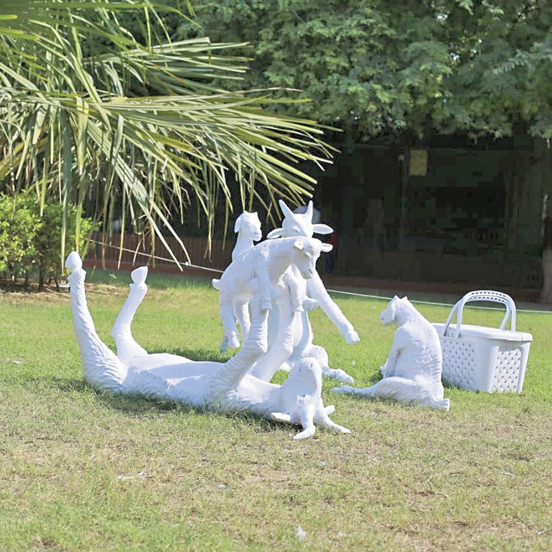 Karachi Zoo featured 13 talented artists and their beautiful artworks that addressed various matters. One of the art pieces that stood out was Irfan Gul Dahri’s installation, titled ‘Picnic’, which displayed a family of life-sized goats. Dahri had already been working on exploring the similarities in the natures of animals and human beings in the past and continuing his investigation, he was deeply influenced by how the class and caste system in our society reflected the hierarchy found in the jungle. To show this idea, Dahri made a family of goats, their posture, behaviour and attributes being very similar to a middle-class family having a picnic in a park. This satirical lens created by Dahri is a spectacular representation of how our lives are complicated and divided by the means of grouping people based on the amount of money, fame or power they have and how that affects the surroundings.