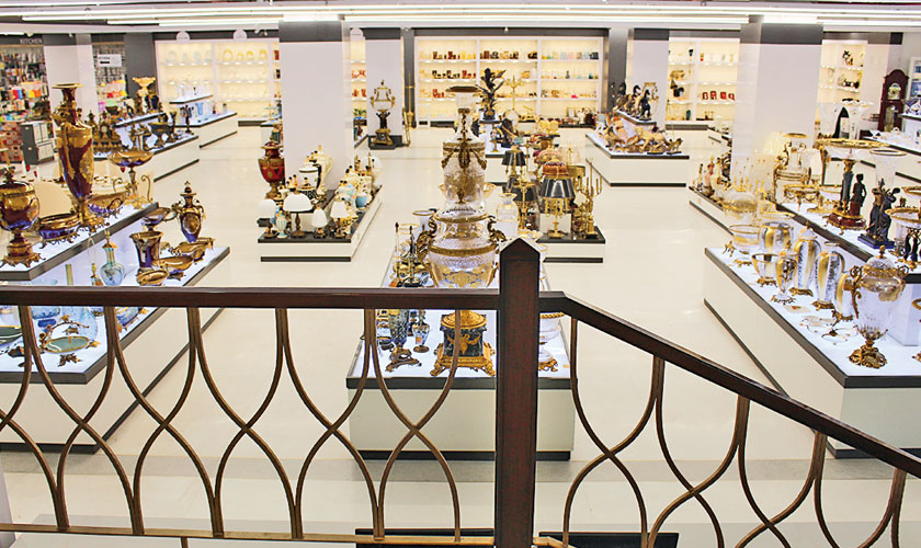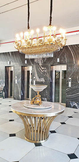 In the two Al Fatah Department Stores, Lahore, Shireen’s latest interior projects, the design is reminiscent of the iconic and historic department stores found in cosmopolitan cities of the world. “I wanted to design a luxury store which gives different aesthetic and emotional experiences to people, and inspires them to have an enjoyable time shopping there. The two stores were designed with the same design concept but because the architecture and scale of the buildings was different there are minor variances. The Johar Town store was a six-floor box of a building with no windows, low ceilings and lots of structural columns. The design dilemma was how to make it grand and luxurious. I opened up windows with faux balconies on each floor bringing in natural light on all the lift landings. A grand double height wrought iron entrance was created leading to a lobby lit up by classical chandeliers. The colour palette selected for the terrazzo floor and other surface finishes was black, white and grey with accents of gold in the brass inlay in the floor and in the art deco inspired staircase.”