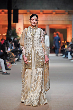 The collection was an ode to indigenous Pakistani arts and crafts like the bandhani, chapa print, tie & dye, crushed fabrics and vibrant screen prints, juxtaposed with pieces that are replete with flowing paisley motifs and burnished-metallic tints that resound with the Turkish tradition of decorative illustrations. The flowing ethereal garments in hues of midnight blue, rich pinks, resplendent teals and golden mustards channelled royal splendour through floral patterns embellished with age-old crafts like zardozi, Kashmiri tanka and vibrant threadwork called resham ka kaam. This collection, with its contemporary spirit, was designed to resonate with the modern, luxury consumer in the new normal.