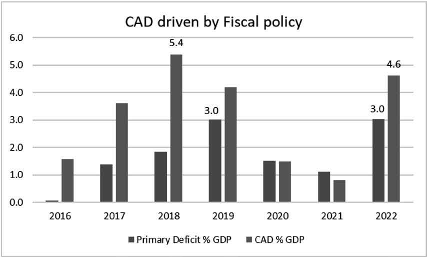 At the outset, we need to figure out the core problem. While the popular notion that ‘we’re confronted with a current account challenge’ is perhaps correct, but it’s the symptom; not the cause of our problem. Current Account Deficit (CAD) is our Achilles heel, but it is driven primarily by fiscal policy, which essentially propel consumption led growth. The balance of payment crisis of 2013, 2018 and 2022 were driven by higher budget deficits. The real problem is our fiscal policy and the mounting government debt. As the solution to all our problems in our formidable years was the “CTRL ALT DEL button”, and this is perhaps the time to it press that button, and review our fiscal policy afresh. We need to resolve to overcome the challenges of low tax collection, rising pension bills, bailouts of loss making State Owned Enterprises (SOEs) and untargeted subsidies.