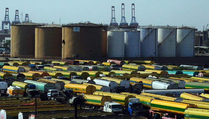 In this file photo, an overview shows tankers parked outside a local oil refinery in Karachi. — AFP/File