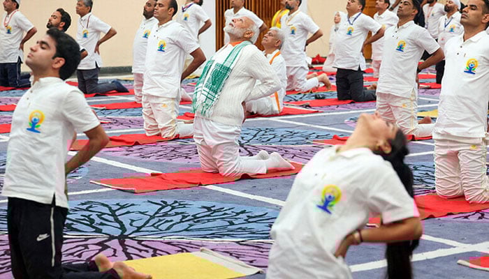 HELD SRINAGAR: Stretching, arching his back and kneeling on a mat, India´s Hindu nationalist Prime Minister Narendra Modi led hundreds of people performing yoga in Indian Illegally Occupied Jammu and Kashmir (IIOJK) on Friday.
