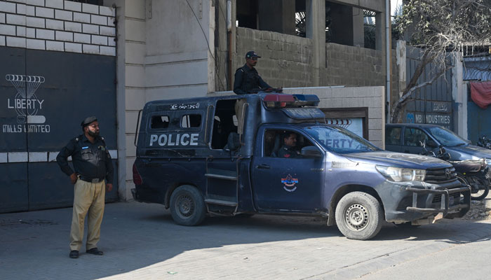 Police personnel stand guard outside a factory where two Chinese nationals were allegedly shot, in Karachi on November 5, 2024. — AFP