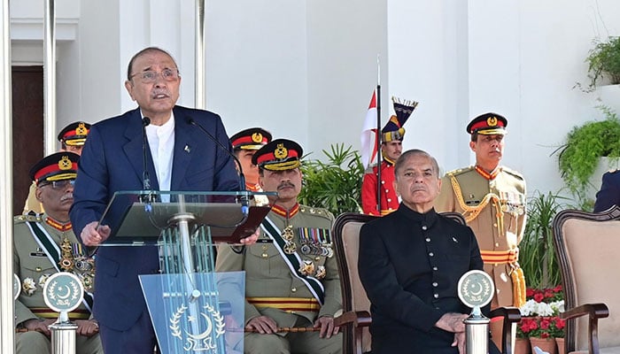 Prime Minister Shehbaz Sharif, Speaker National Assembly Sardar Ayaz Sadiq, Chairman Senate Syed Yusuf Raza Gilani, three services chiefs, top military leadership, federal ministers, parliamentarians and members of the diplomatic corps were present during the ceremony. President Asif Ali Zardari said India had always tried to cast an evil eye on Pakistan while Khwarij and other terrorists’ outfits wanted to achieve their evil designs, but he wanted to tell them that the nation and the armed forces were standing in unison and would foil their nefarious designs.