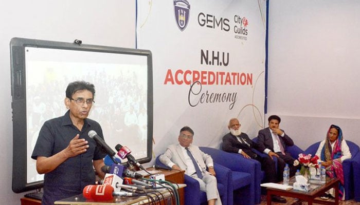 Federal Minister for Education and Professional Training, Dr Khalid Maqbool Siddiqui addressing the participants of NHU ceremony.—APP/File