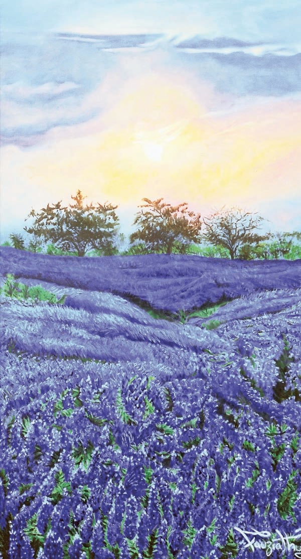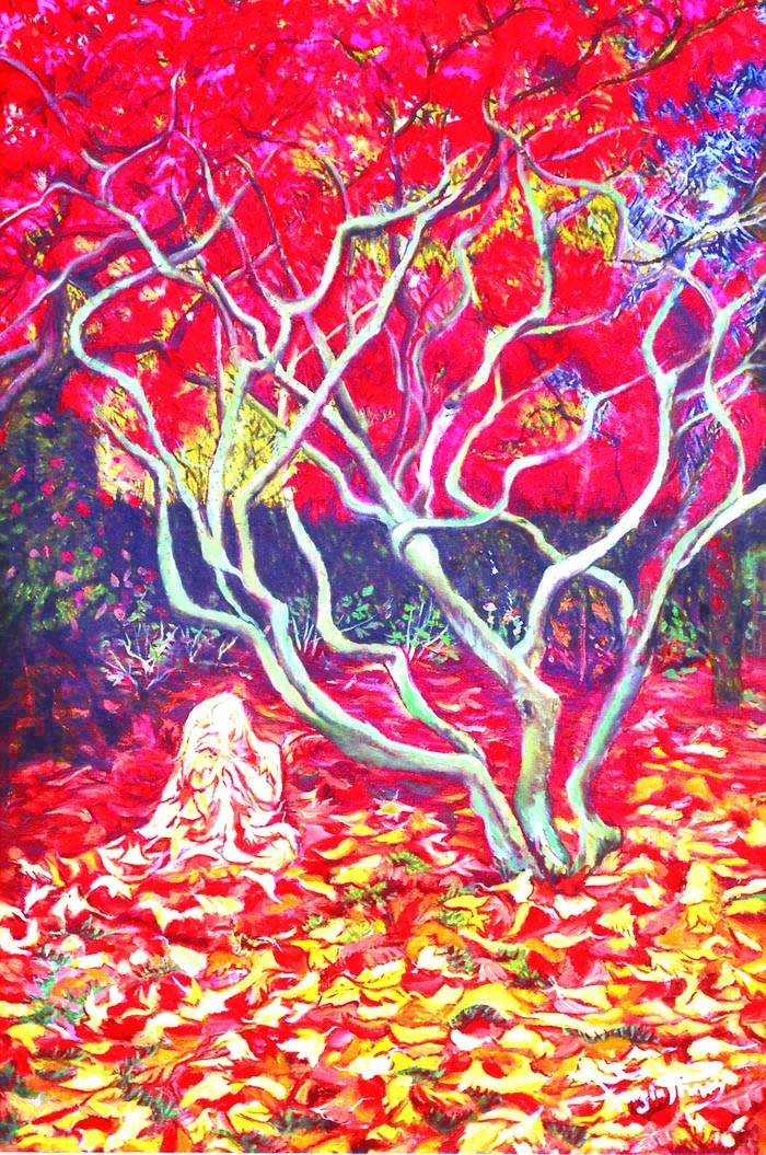 Similarly, another of her work, ‘Autumn is My Season’, is a dream-like representation of a river flowing through a valley, with an angel-like apparition. Apart from these, most of her works are a beautiful exercise in realism. The meticulous paintings depict the landscape of the area. One of her works, ‘Heaven’s Vistas’, is a winsome depiction of a lush green mountainside interspersed with cottages.