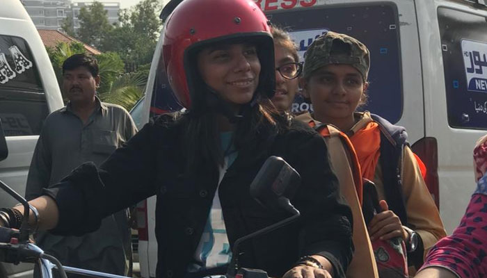 At the event, Sindh Women Development Minister Shehla Raza sat astride a motorbike driven by a woman, just like the late human rights activist Asma Jahangir had done in Lahore to shun patriarchal pressures of how women must sit side-saddle on a motorbike, even at the cost of their safety.