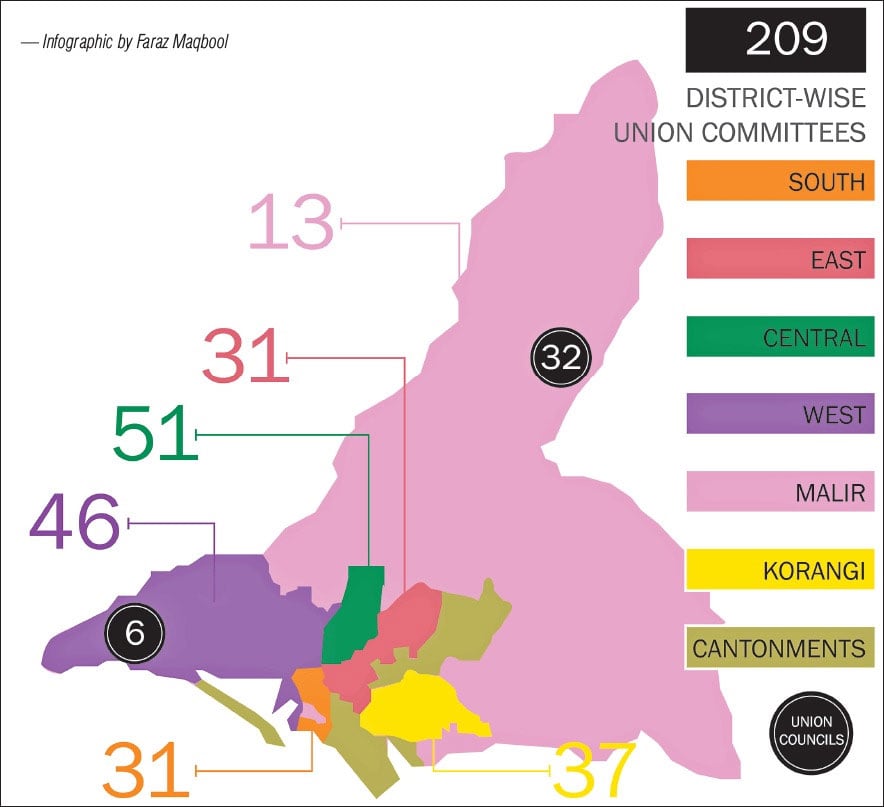 The only thing that is common in all the three programmes is the involvement of district administrations. As for Karachi, there are six districts in the city comprising a total of 209 union committees for its urban areas and 38 union councils for its rural localities.
