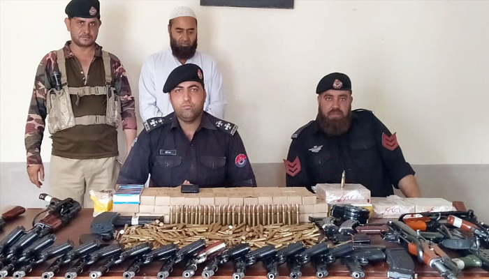 Meanwhile, a passenger coach was stopped for search at Muslimabad checkpost on Indus Highway and arrested arms smuggler identified as Aurangzeb, resident of Sarai Naurang (Lakki Marwat), and a total of one rifle, 4 pistols, 5 chargers and 350 different bore cartridges were recovered from his possession.