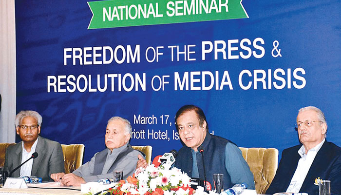 The seminar was also addressed by Federal Minister Fawad Chaudhry, former prime minister Shahid Khaqan Abbasi, former minister Ahsan Iqbal, former Senate chairman Raza Rabbani, PPP’s Farhatullah Babar, PFUJ President Shahzada Zulfiqar, Secretary General Nasir Zaidi, former president Afzal Butt, RIUJ President Amir Sajjad Syed and Vice-President Maira Imran.