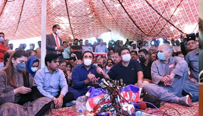 Opposition Leader in the National Assembly and President PMLN Shehbaz Sharif, Chairman PPP Bilawal Bhutto Zardari, President PDM and JUI-F Fazlur Rehman, former prime minister and opposition leader in the Senate Syed Yusuf Raza Gilani, former prime minister Shahid Khaqan Abbasi, Ahsan Iqbal, Senator Sherry Rehman, Faisal Karim Kundi, Dr Nafisa Shah, Marriyum Aurangzeb, former chairman Senate Mian Raza Rabbani, PKMAP chief Mehmood Khan Achakzai and leaders of other opposition parties attended the sit-in.