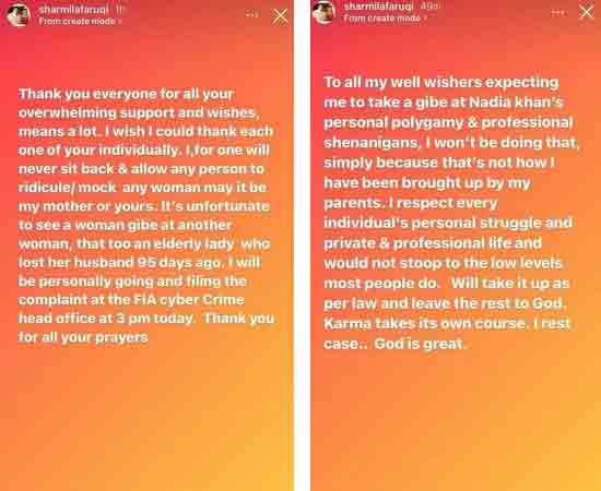 FIA’s cybercrime cell head, Imran Riaz in his tweet mentioned that FIA has initiated legal action against TV celebrity Nadia over Faruqui’s complaint. “MPA Sharmila Faruqui has launched a complaint about a video in which it is claimed by her that Nadia Khan is trying to ridicule her mother and video has been uploaded without her consent.