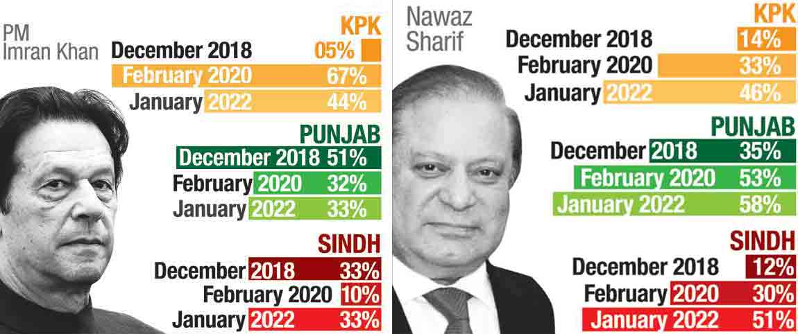 However, in the case of Nawaz Sharif, his approval ratings increased from 33pc to 46pc and that of Shehbaz Sharif rose from 31pc to 43pc in the KP. In the case of Punjab, 58pc respondents approved Nawaz Sharif and Shehbaz Sharif, while 33pc approved Prime Minister Imran Khan, 24pc Bilawal Bhutto Zardari and 21pc Asif Ali Zardari.