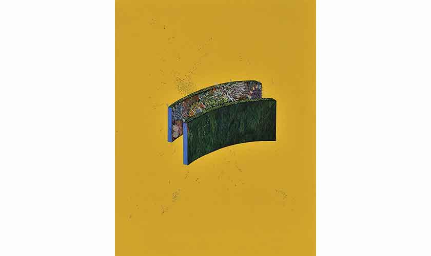 Actually, the artist has reinterpreted the bordersin a traditional miniature painting into spatial, political and social boundaries. Flowering trees, bright and colourful vegetation, overcrowded growth are contained ina cube,Mosaic of Processes 2. Confined to two curved forms,The Stairwell of a Garden covers the inner surface of a circular structure.The Grass that Keeps, consists of a wall with sharp turns and edges.