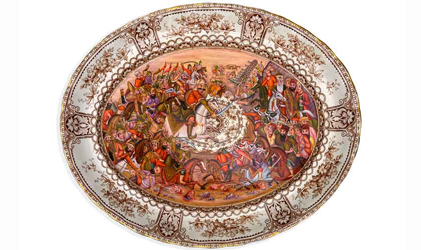 Three of these dishes depict scenes from Qajar courts (A Princely Redemption, The Acrimonious Melon Eater, Qajar Resurrection), withthe monarch surrounded by lavish items, background and courtiers. The unsettling element in two of those – normallythe decorative/touristic artefacts – is Suleman’s intervention into an otherwise calm and tame imagery.