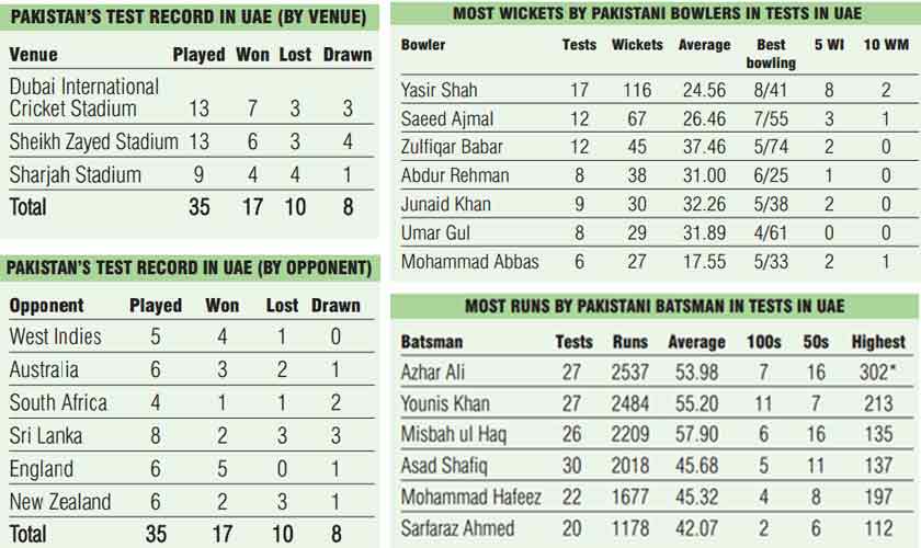 Yasir Shah has been Pakistan’s most successful Test bowler in the UAE by far, with an aggregate of 116 wickets in just 17 Tests. Saeed Ajmal, with his difficult to decipher combination of off spin and ‘doosras’, is second with a tally of 67 wickets from 12 Tests. Zulfiqar Babar is third in this list with 45 wickets, also from 12 games. Yasir Shah’s bag includes 8 fifers and 10 wickets in a match twice. Saeed Ajmal has 3 fifers and one 10 wickets in the match haul. Mohammad Abbas has the best average with his 27 wickets costing just 17.55 runs apiece. His tally also includes 2 fifers and a 10 wickets in a match return. Interestingly the top four wicket aggregates also belong to spinners.