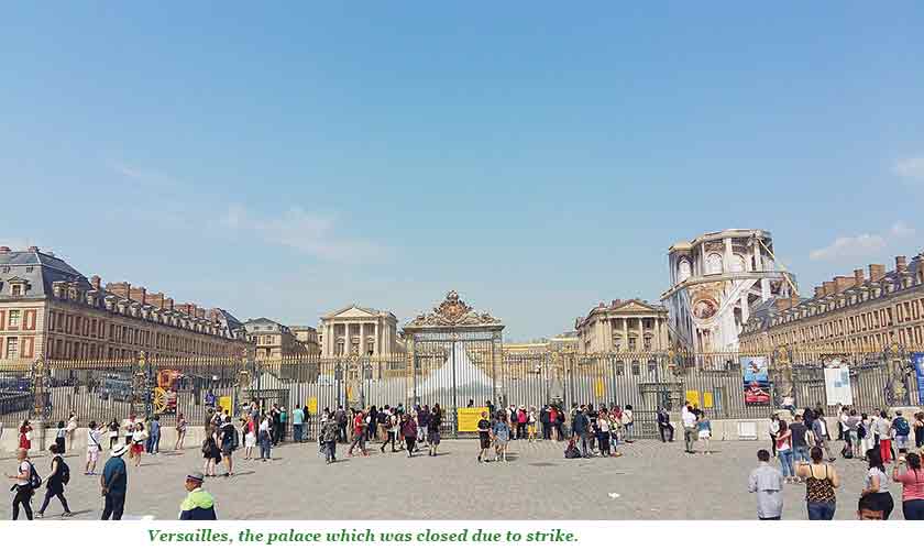 We were excited to see the best of French architecture. However, the excitement was short-lived. Like hundreds of other tourists, we approached the gate to buy entry tickets, only to be greeted by a yellow signboard: “Due to strike, the Palace and the Estate are closed. Sorry for the inconvenience.”