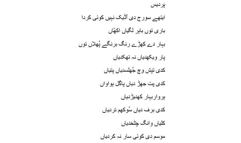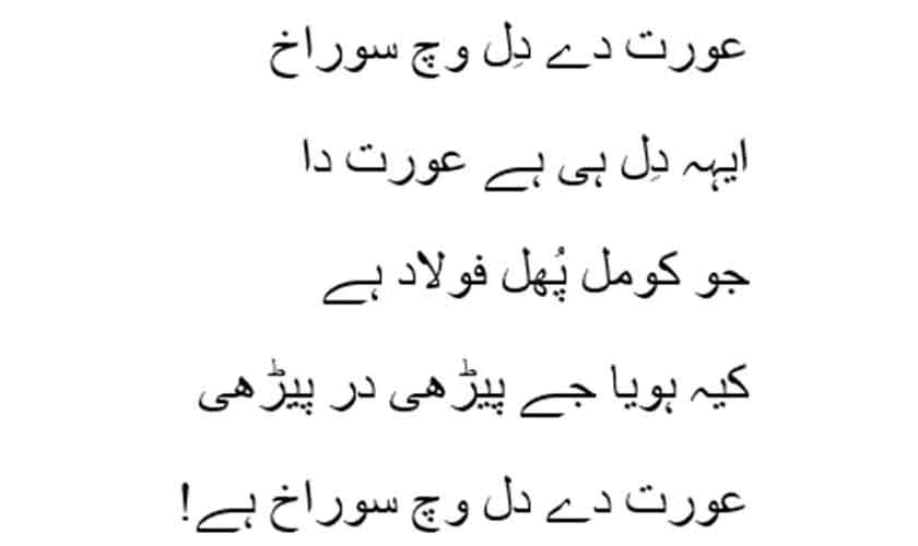 Even the titles of her poems give voice to women, with examples like Aurat, Aurat day Hatth (A Woman’s Hands), Aurat day Pair (A Woman’s Feet), Aurat da Chehra (A Woman’s Face), and Aurat day Dil Vich Sorah (The Yearning in a Woman’s Heart).