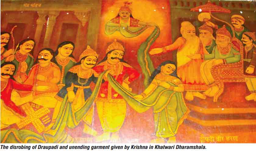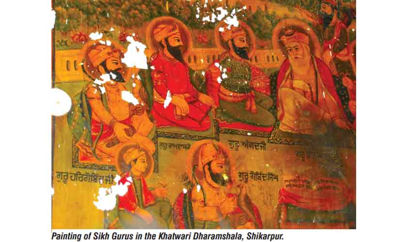 The Khatwari Dharamshala, located in Shikarpur’s Meena Bazaar, is one of the most imposing buildings. It is noted for its exceptional mural paintings. The main hall of this Dharamshala or Darbar houses the Guru Granth Sahib alongside an image of Baba Sri Chand, the eldest son of Baba Guru Nanak and the founder of the Udasi Panth. The walls of the hall are adorned with mural paintings that vividly illustrate scenes from Hindu scriptures and portray Sikh gurus and saints. Ten Sikh gurus are depicted on one wall of the Khatwari Dharamshala. Another wall features the Cheer Haran scene, or the disrobing of Draupadi, along with Krishna’s provision of an unending garment. Apart from the depiction of Draupadi’s disrobing, several other themes are painted on the walls of the Khatwari Dharamshala.