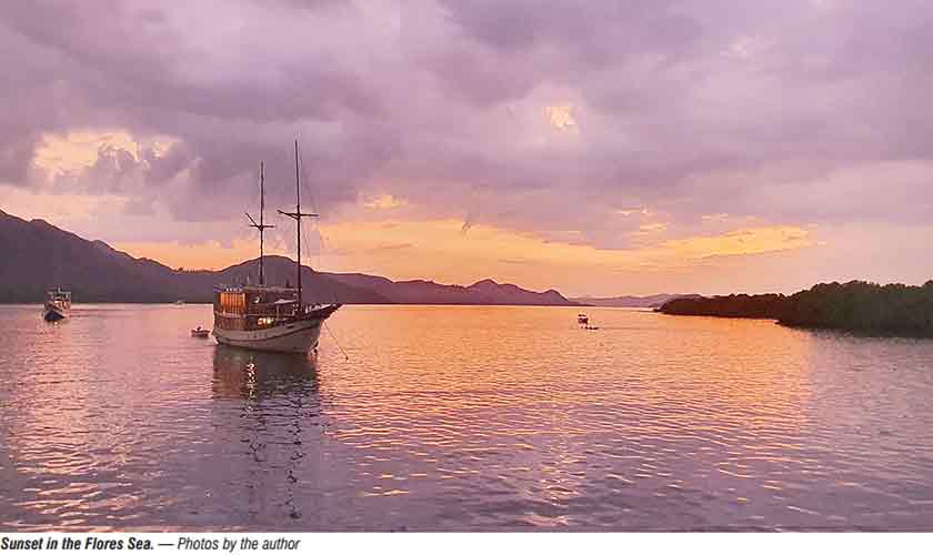 On my last evening on the boat, as I sat on the deck watching the sunset across the sea, I wanted to capture the moment, to lock in every sensory detail. A gentle breeze blew as water lapped against the side of the boat. The rope dragging our smaller tender grazed against the rails, creating a rhythmic sound. The Komodo sunset is unforgettable. The colours of the sky, mixed with clouds and reflections from the water, created a blend of violet, purple, red, pink and orange that defies accurate description. Outlined against this vibrant background were small islands teeming with incredible nature.