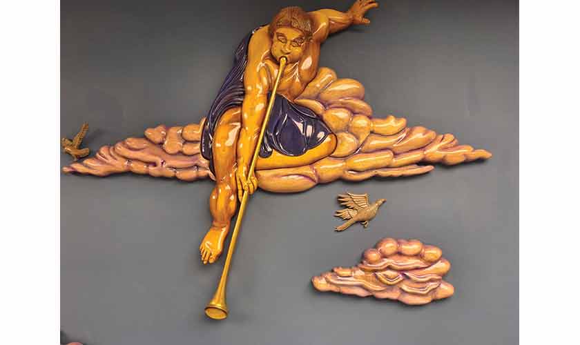 Suleman’s reliefs focus on specific scenes, including angels blowing trumpets and resurrecting the saved souls, an angel holding an open book of deeds or records toward them and a horror-struck man who has just heard his verdict, with a green demon clinging to his lower half, seemingly pulling him down. Surrounding these larger than life figures are clouds, the upper torsos of two human beings awakening, and a scattering of flying and standing crows.