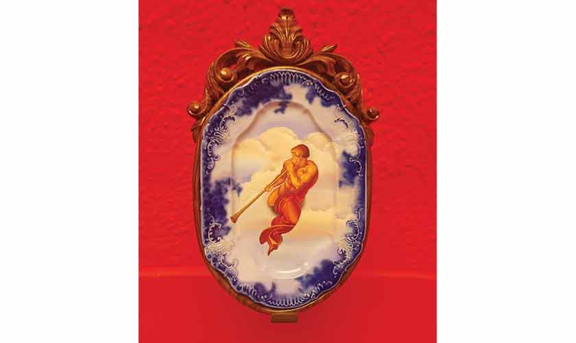 In a separate section of the exhibition, Adeela Suleman presents three found vintage ceramic plates, intricately painted with segments from The Last Judgment. The First Clarion Call and The Final Clarion depict angels who, in Michelangelo’s fresco, are positioned above the condemned, directing their trumpets away from these damned souls. The third plate, Towards Perpetual Torment, features a demonic figure surrounded by monsters. In the original fresco, Michelangelo famously replaced the head of the devil with the face of Biagio, the Vatican’s Master of Ceremonies, who had protested that the artist had painted him “tormented as a devil in inferno.” The Pope dismissed Biagio’s complaint with a wry remark, admitting his powerlessness to intercede in hell.