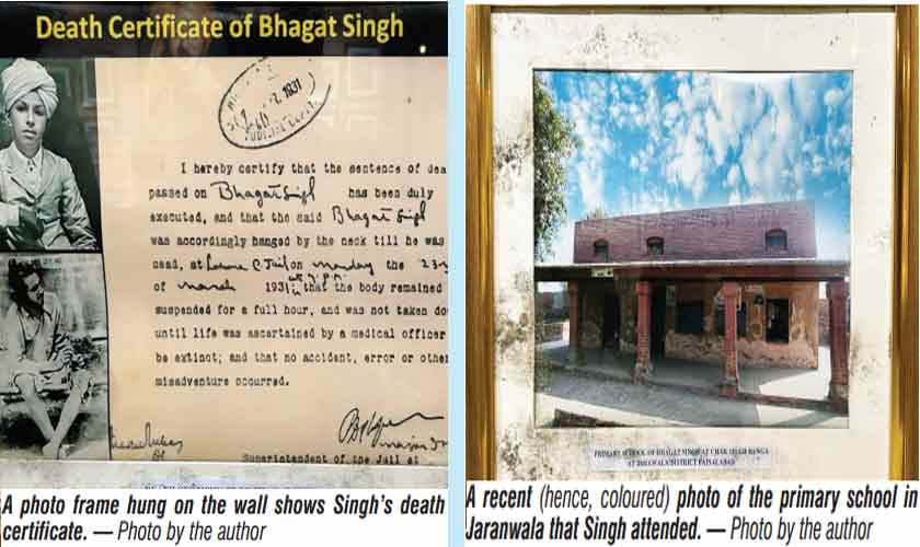 The display includes photos of Singh’s belongings — a watch, which he is believed to have gifted to a friend (and co-revolutionary) Jaidev Kapoor; the shell of the bomb he hurled at the British forces; and his shirt. There is a replica of a poster of the Hindustan Socialist Republican Association that was issued after Saunders’ death. Also, there is a recent (hence, coloured) photo of the primary school in Jaranwala that Singh attended. A letter, written by Singh to his younger brother, Partap, from his death cell, is of particular interest to the visitors.