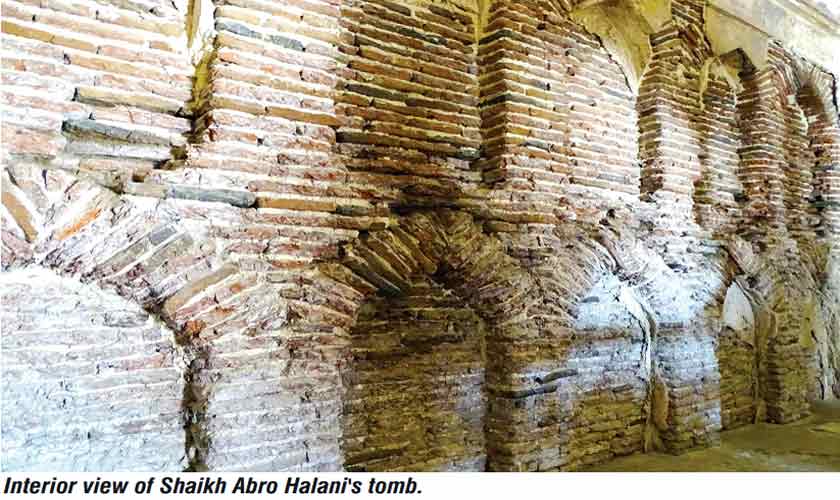 There are three tombs in the cemetery of Shaikh Abro Halani. The principal tomb belongs to Shaikh Abro Halani, who died in 1239 AD. It is an impressive structure that appears to have been built in the Eighteenth Century. If one examines the architecture of tombs across the Jati tehsil, it becomes evident that most were constructed in the 17th and 18th Centuries. Although some of these tombs have been renovated, they still retain original elements that help in determining approximate dates of their construction.