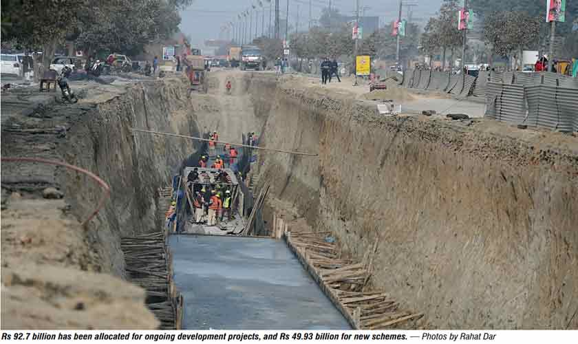 Rs 92.7 billion has been allocated for ongoing development projects and Rs 49.93 billion for new schemes. The latter include road rehabilitation in the Ravi Zone (budgeted at Rs 5.45 billion) and road construction in the Data Ganj Bakhsh Zone (Rs 2.16 billion).