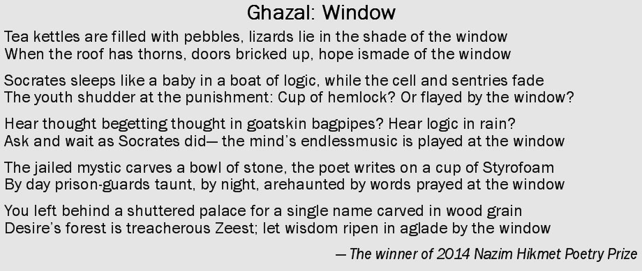 SZH: Contemporary poetry in English has absorbed many foreign forms -- from Japanese, Italian, to Malay and French. Poetry written in these forms has, over time, become an inextricable part of the American literary tradition. In the past fifty years or so, the ghazal has also joined this tradition. Poets continue to experiment with this form, some very successfully so.