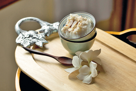 A cup of previously cooked rice is gently cooked again with coconut cream, sugar and spices; the long grains slowly swell up with pride and subtle sweetness of coconut cream; whether eaten warm or cold, once spiced with cinnamon and toasted coconut flakes, this is a crowd puller and pleaser!