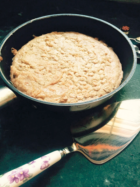 Spread out the mixture in a well-buttered pie dish (skillet in my case) and bake in a pre-heated oven 180C (350 F) for about 20 minutes.