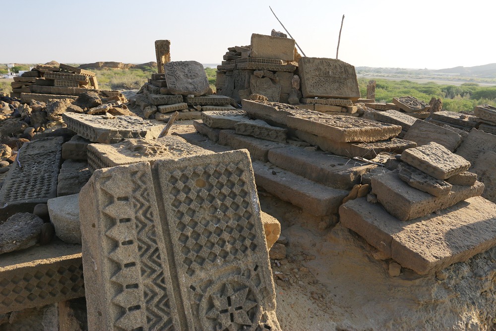 Just off the road, on a low mound, is a cluster of ruined elaborately-carved sandstone tombs. These are in the same style as the well-known Chaukandi graves just outside Karachi on N-5 and at a couple of dozen other sites around Sindh and Balochistan. Now because some of the tombstones are carved with Arabic letters, in their utter ignorance, the unworthies of the guilty departments could only presume they were the work of the Arabs.
