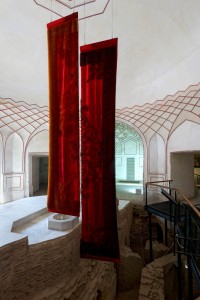 Aisha Khalid explores location for its maximum impact with her installation of mirror at the base of the central space in Shahi Hamam. Mirrors not only extend the actual area (as mirrors tend to) but the reflection in some way reconnects with the initial function of the building, royal bath, so the mirrors serve as virtual water reflecting the ceiling.