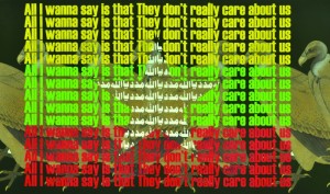 In the same sense, the flags created by Muhammad Zeeshan in his exhibition strictly do not exist in their present formats with text, patterns and pictures. But who knows, in future, these may become the most respected, popular and circulated national emblems -- like the Pakistani flag with an image of Quaid-e-Azam or Mickey Mouse sold on every street close to Independence Day celebrations in August.