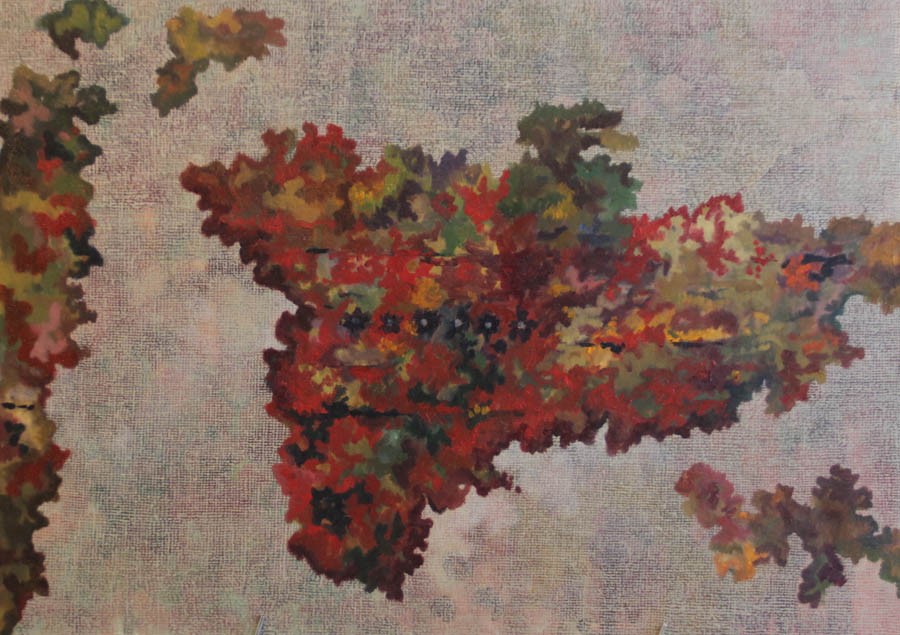 Baniasadi’s surfaces are tactile, tender and sensitive, and these can envelope you in their visual intricacies and complexities, just like the experience of stepping on a carpet which receives you in its softness and comfort. Her work from the exhibition is remarkable in terms of her extrapolation of a traditional motif and modernising it for a purely sensuous purpose. Selective palette, subtle use of various hues, application of paint that connotes a carpet texture, and compositions that invoke landscapes and maps make her paintings distinct. Her sophisticated surfaces are a way of revisiting the past and at the same time a logbook entry of being away from the past.