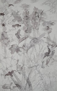 Rustomji has absorbed that kind of imagery and created pieces which are more personalised and lyrical. Employing water-based mediums to make works on paper that still relate to historic sources, this body of work addresses more than merely the past; it makes the tradition relevant and alive. No matter if an ancient pictorial practice is from Africa or Amazon, one can still associate with it, because it exists and operates on a shared ground: of instincts, feelings and desires. So when Anushka Rustomji translates the past into present, it transcends not only time but territory and religion; her work turns more universal, like the paintings in which figures from history (or mythology?) are clustered, combined and converted. Just the fact that these figures (drawn with a puncture tool on paper) are arranged on a paper, the composition does not connect to history but is modified for contemporary sensibility.