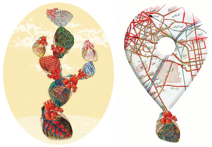 Besides the genesis of his imagery or the recognition of his technique and medium, one is more concerned with mind maps -- not the title of the exhibition but the cartography of the artist’s concepts. It seems he determinedly desires to fabricate a pictorial language that speaks about the contemporary scenario and has a grammar: which responding to our society is made up of multiple ingredients. It includes birds and fish composed of truck art collages, outline of a bull from the Indus Valley civilization, Arabic headdress, Islamic geometry, anatomical hearts, plants and trees from traditional miniature painting and clouds from the same source, barriers and location pin.