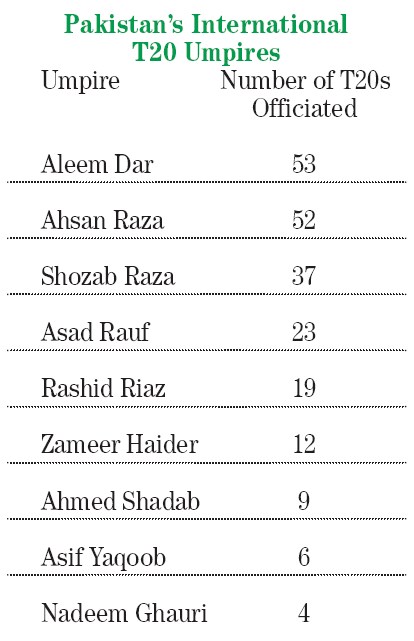 Nine Pakistani umpires have officiated in T20 Internationals. The list is again headed by Aleem Dar with a record total of 53, but he is closely followed by Ahsan Raza on 52. Shozab Raza has umpired in 37 and Asad Rauf in 23.