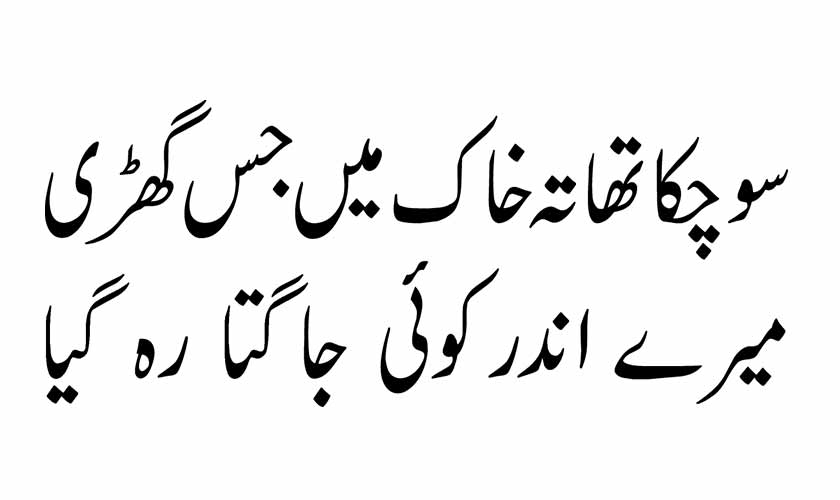 It is the poetry that is most at risk in the act of a translation of poetry. What the sh’er quoted above intends to convey can be said in English language but the overall semantic ambience around these two fairly small lines is hard to reproduce. The meaning(s) of the phrases Tah-i-khak so chuka tha and Koi andar jaagta reh gia are not entirely located in their literal sphere, not even in and around their metaphorical realms as besides literal and metaphorical realms, meanings of poetry are to be found in its cultural-symbolic ambience, in the very act of reading and the moment of reading.